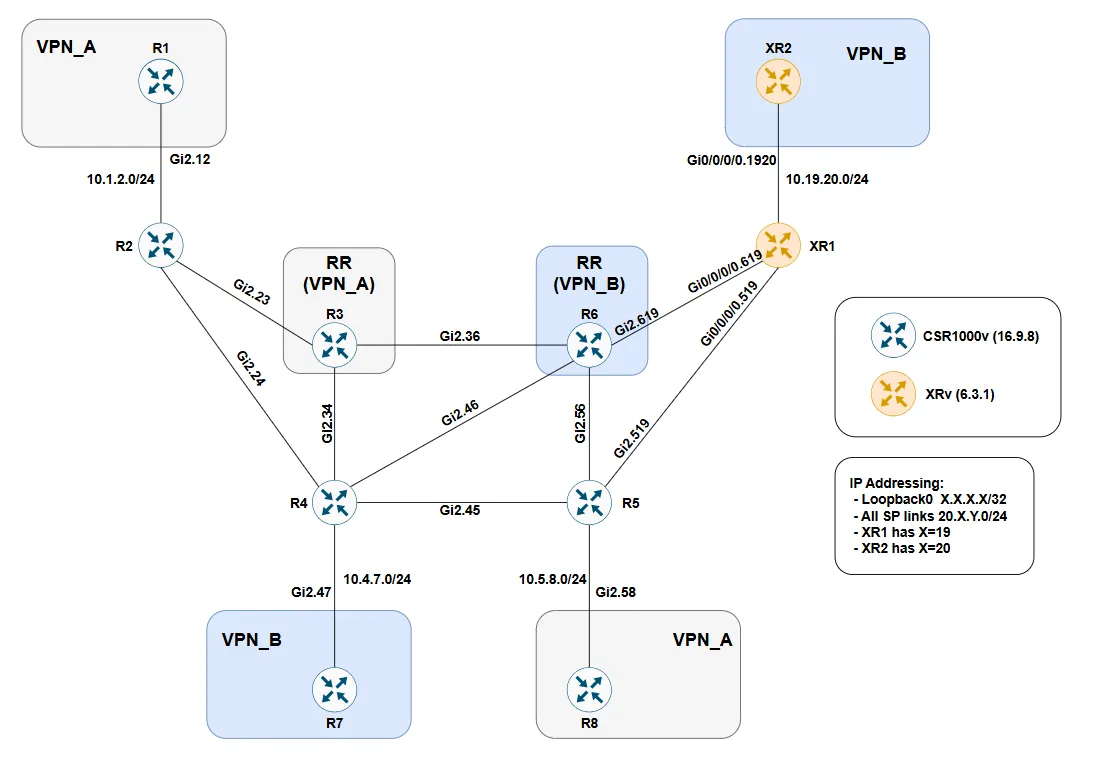 R3 should only reflect routes for VPN\_A, and R6 should only reflect routes for VPN\_B. When you look at the VPNv4 table on each RR, you should only see VPN\_A routes on R3, and VPN\_B routes on R6. Achieve this by only configuring the RRs.