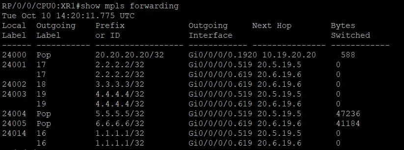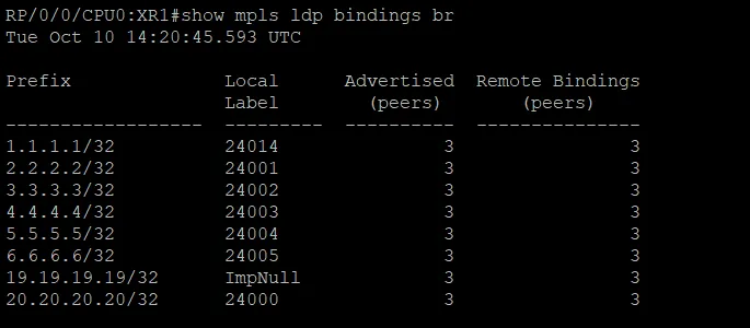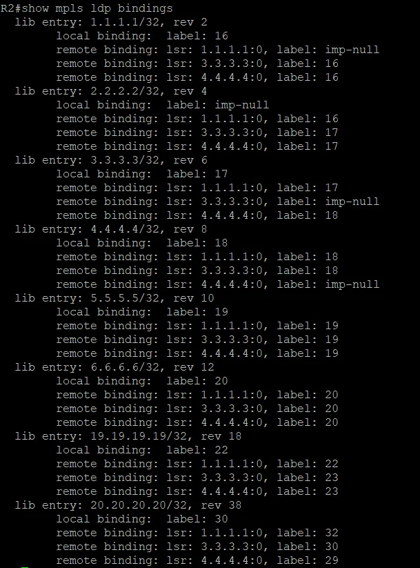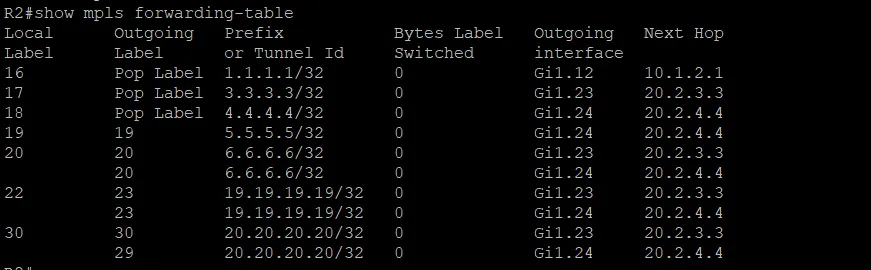 On any router in the topology, we should only see /32 prefixes in the LFIB and LIB. It does not matter which router we look at, because both the ACL/prefix-list method, and the built-in **for host-routes** method, have the exact same effect.