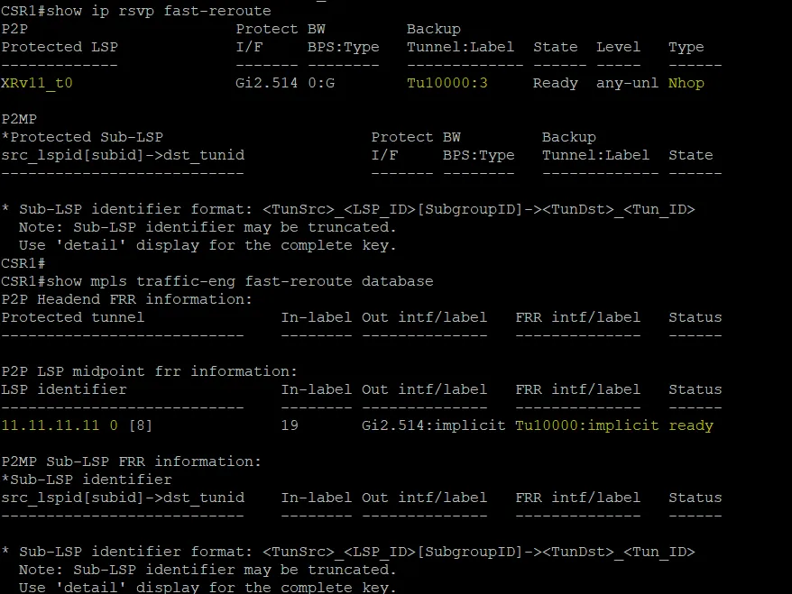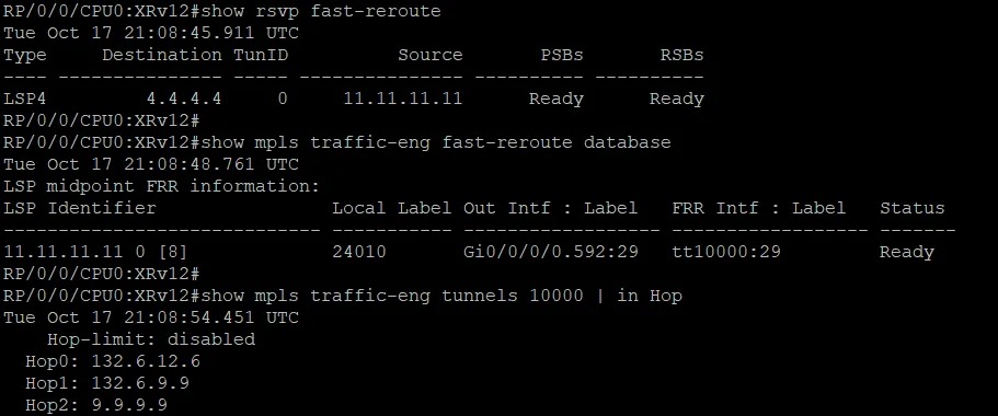 We can use our standard verification tools for general FRR to verify that the auto-tunnel backup paths worked.