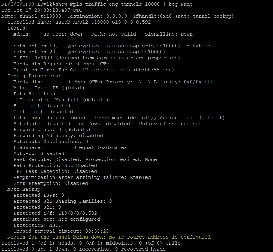 If you forget to set the unnumber interface or the tunnel-id range, you can see the reason the auto-tunnel is down in the “Reason for tunnel being down” section (last line of output).