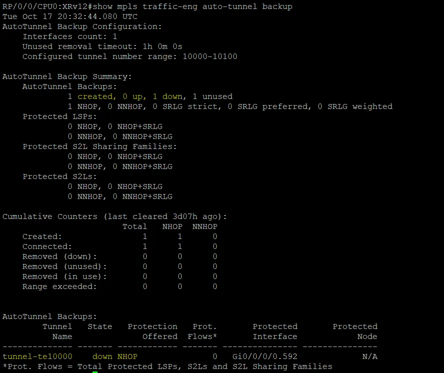 Additionally, on IOS-XR, the global parameters for auto-tunnel backup are configured under **mpls traffic-eng auto-tunnel backup**. You must specify a tunnel ID range on IOS-XR. IOS-XE can use 65436-65535 by default if none is specified.